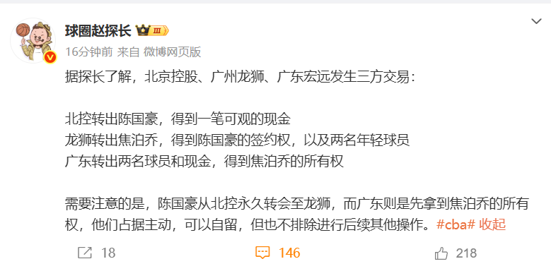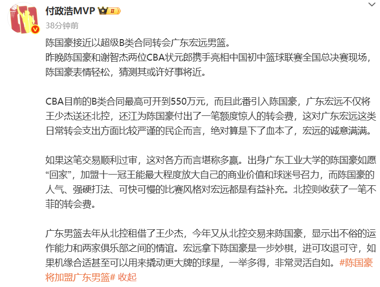 交易得到陈国豪,对于广东队锋线上是个补强,那么接下来广东队的第四外援引进,将有更大的选择空间,可以视球队需要再来小修小补,退一步来说,如果后期广东队还想交易补强,从其他球队交易更加大牌的球员,陈国豪也能作为一个不错的筹码来用,而就在付政浩发布完消息后不到一个小时,另一位知名媒体人“赵探长”又发布了一条更加重磅的消息。